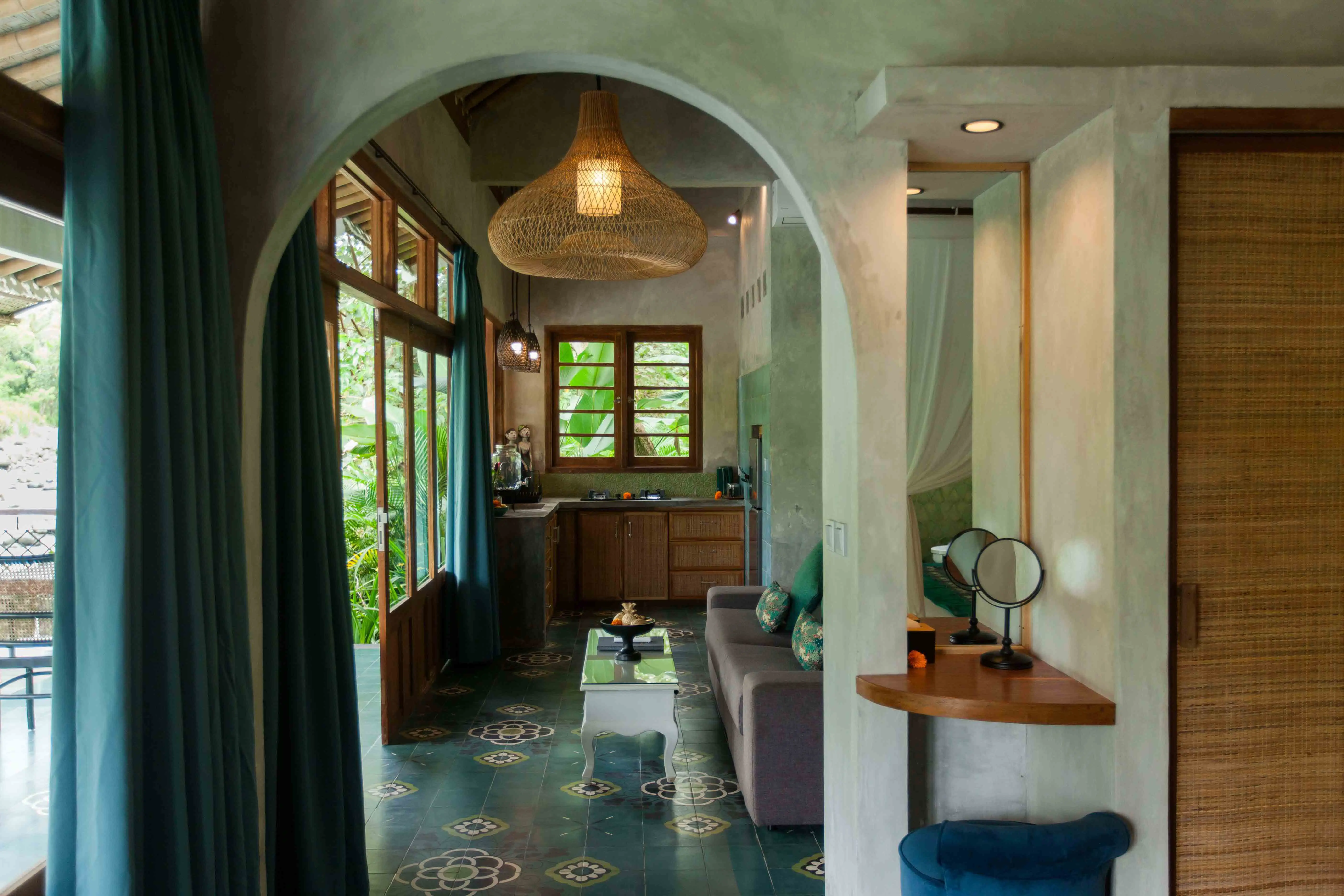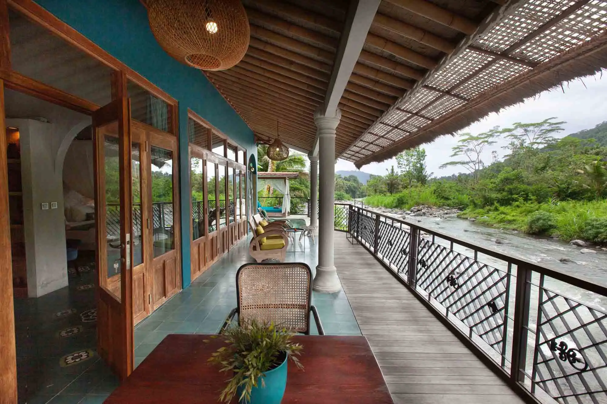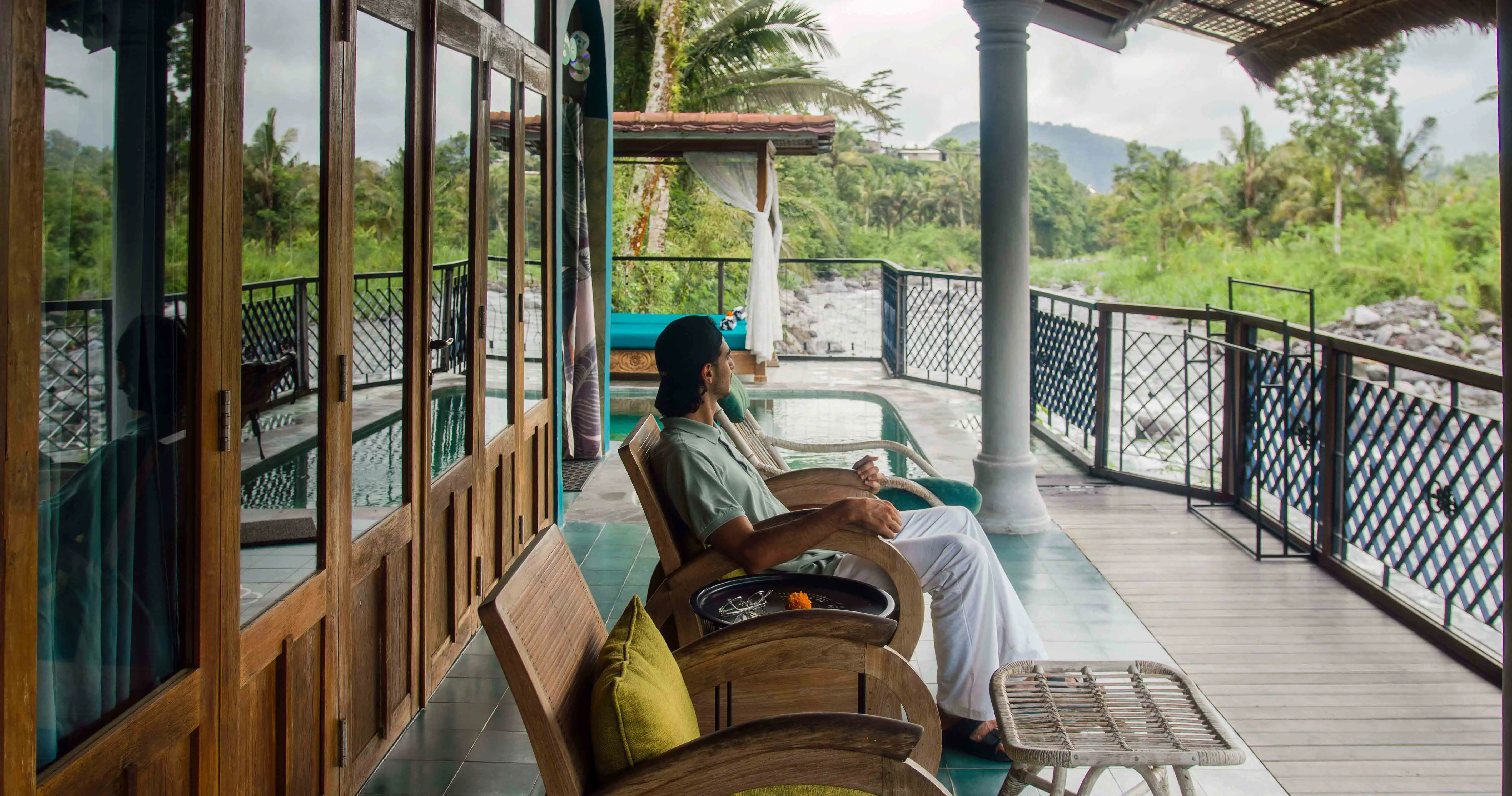Our River Villa embodies a beautifully designed space, nestled admits lush natural surroundings at the riverfront. It is a private oasis with a serene view. There is a terrace at the entrance with 2 relax chairs, a spacious living area with a kitchen which opens to the riverside terrace with a private pool. The bedroom, which also opens to the terrace, is connected to the living area and equipped with a king-size bed. The private bathroom is open to the riverside, with the shower on the edge.