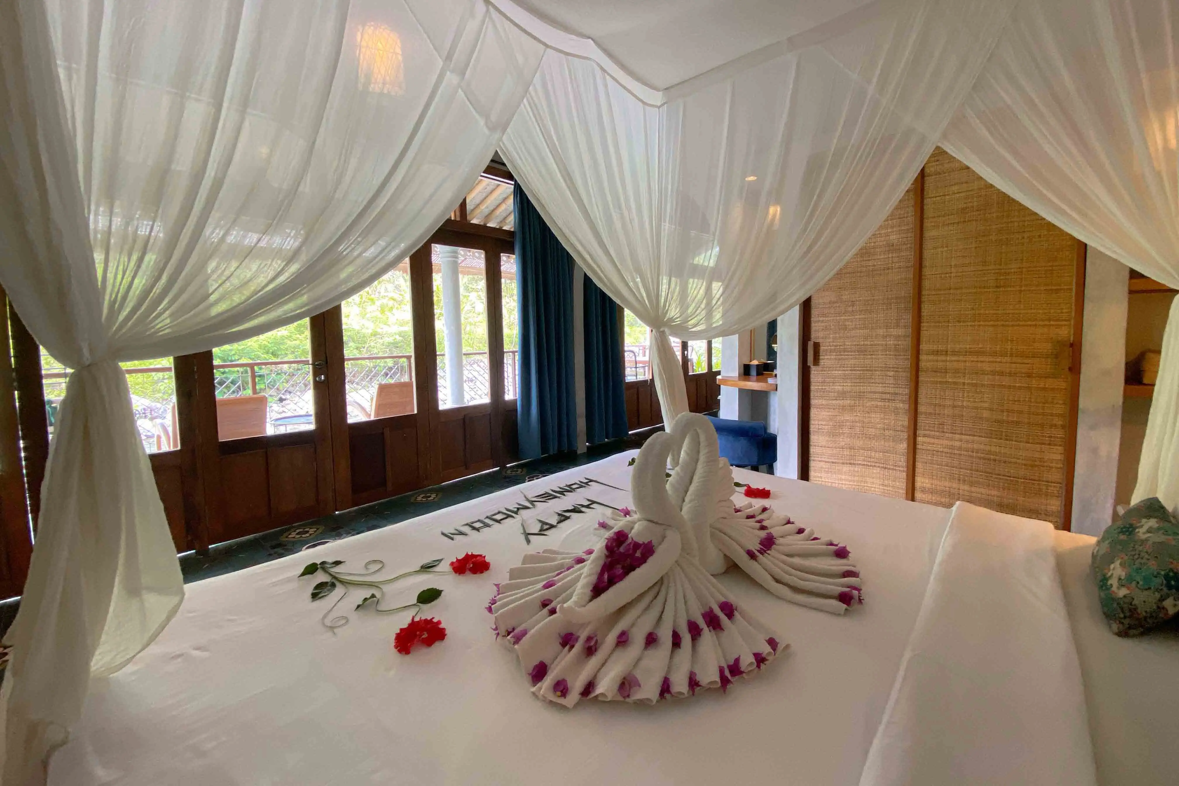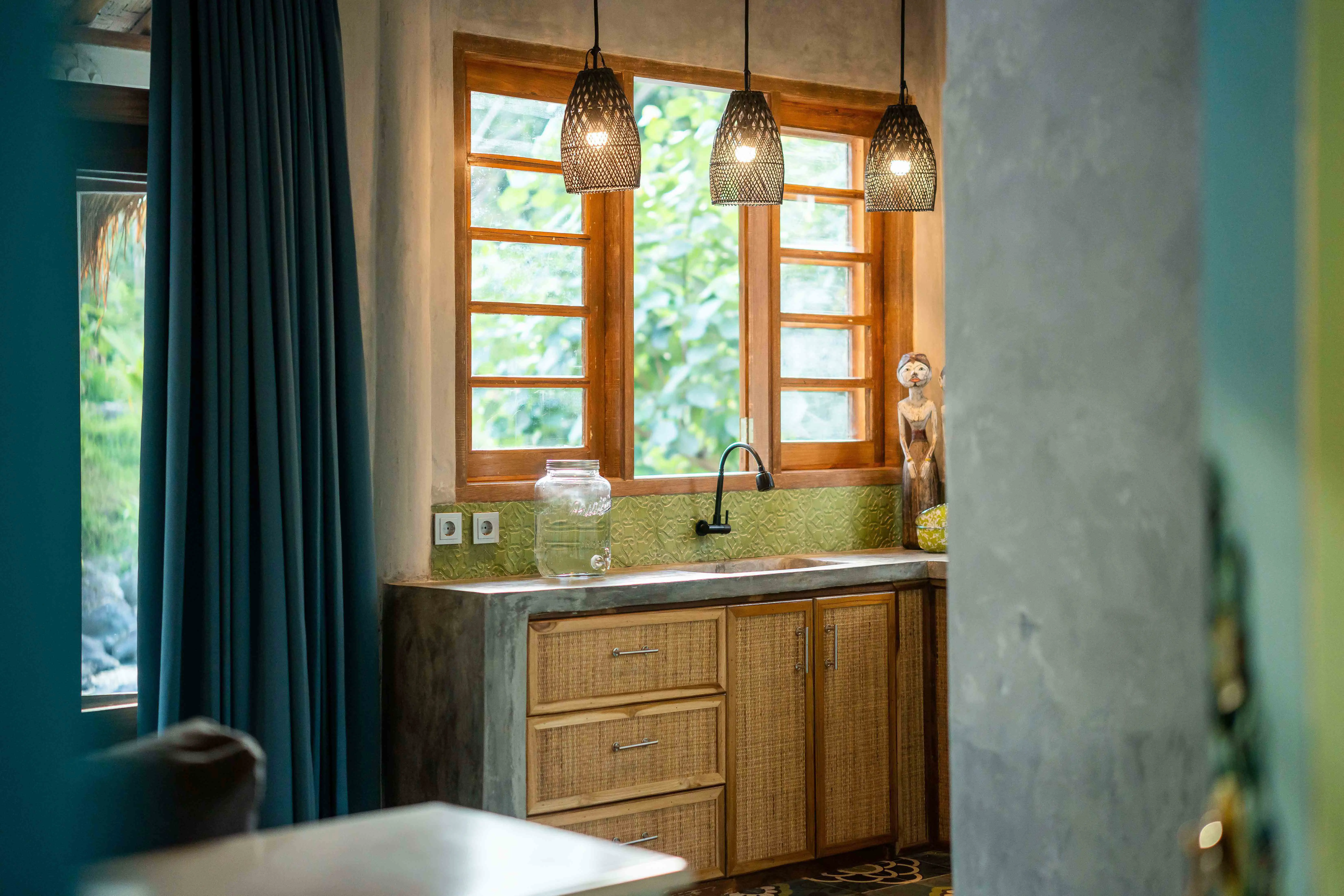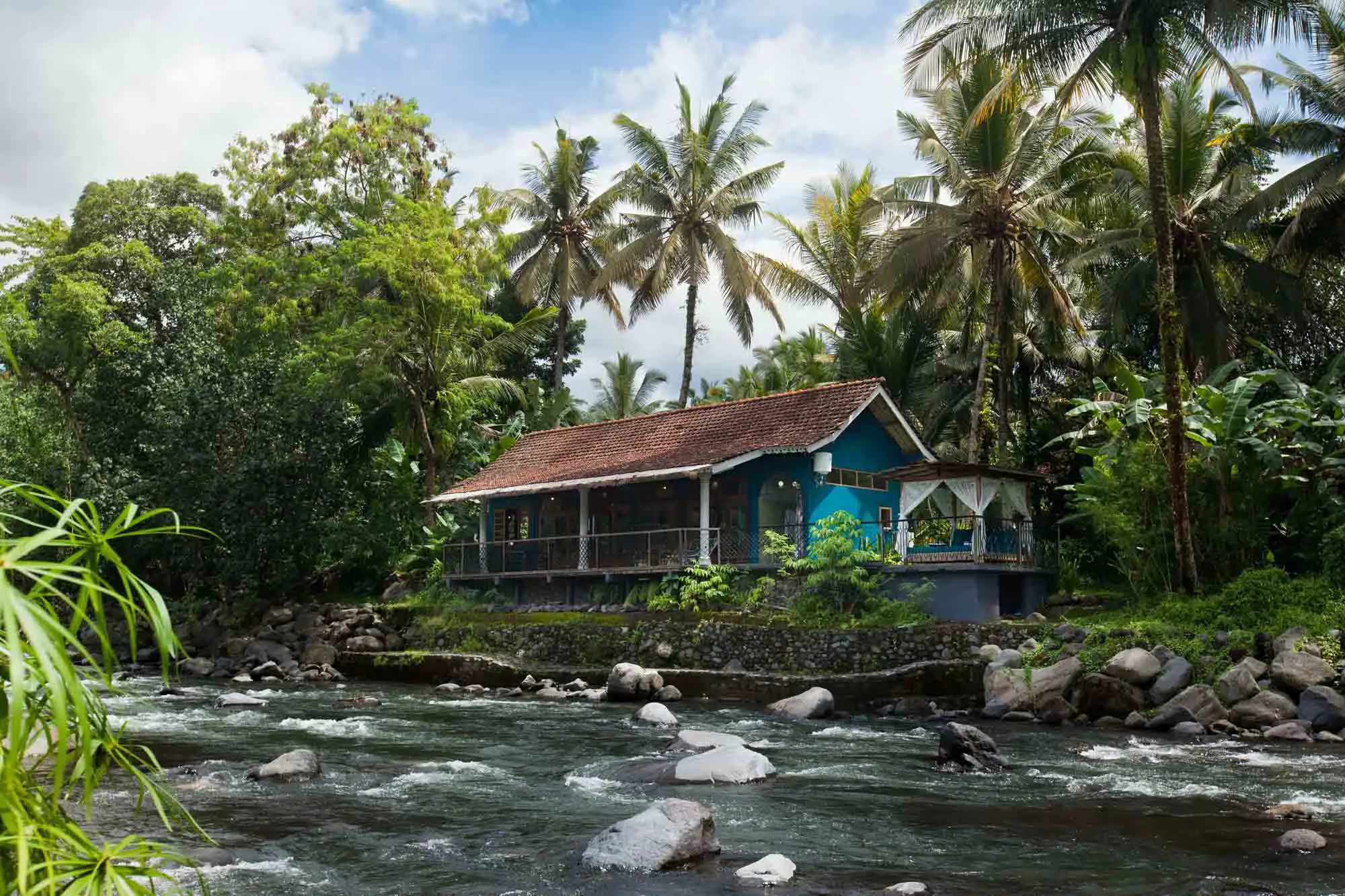 Our River Villa embodies a beautifully designed space, nestled admits lush natural surroundings at the riverfront. It is a private oasis with a serene view. There is a terrace at the entrance with 2 relax chairs, a spacious living area with a kitchen which opens to the riverside terrace with a private pool. The bedroom, which also opens to the terrace, is connected to the living area and equipped with a king-size bed. The private bathroom is open to the riverside, with the shower on the edge.